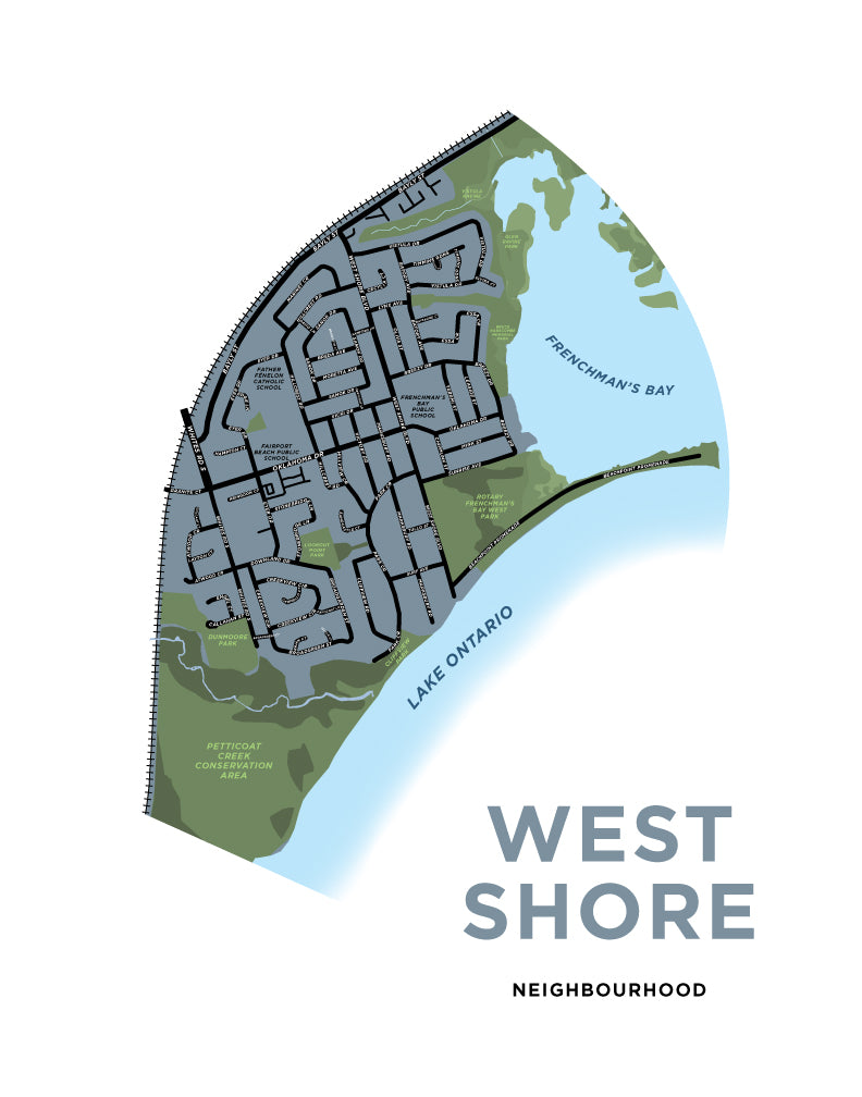 This is a map of the West Shore neighbourhood in Pickering, Ontario. It is generally bordered by Bayly Street, Frenchman's Bay, Lake Ontario and the Petticoat Creek Conservation Area. Some landmarks labelled include Father Fénelon Catholic School, Dunmoore Park and Frenchman's Bay Public School.