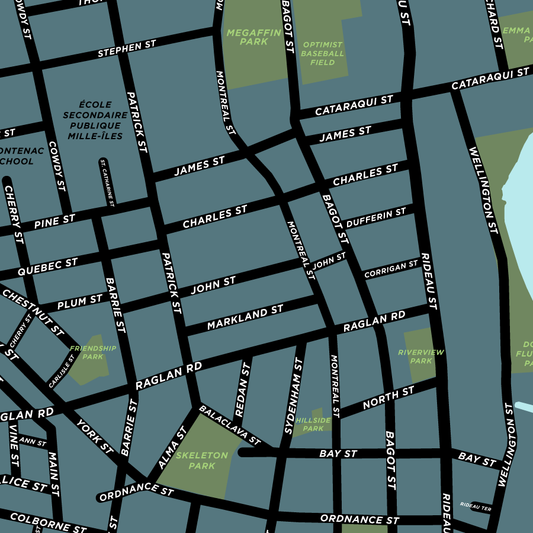 We're slowly building up our collection of neighbourhood maps for Kingston, but so far you can find the Queen's and St. Lawrence campuses, as well as a few neighbourhoods in and around Downtown Kingston. We also have a map print of the full City of Kingston.