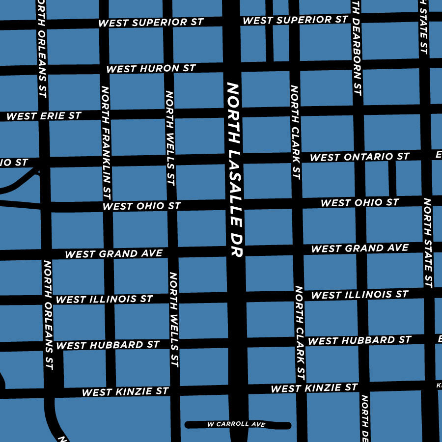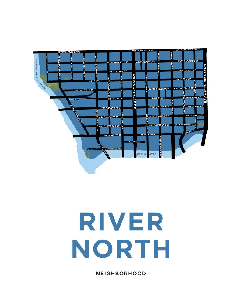 This is a map of the River North neighbourhood in Chicago. It's bordered by Chicago Avenue, North Michigan Ave, and the Chicago River.
