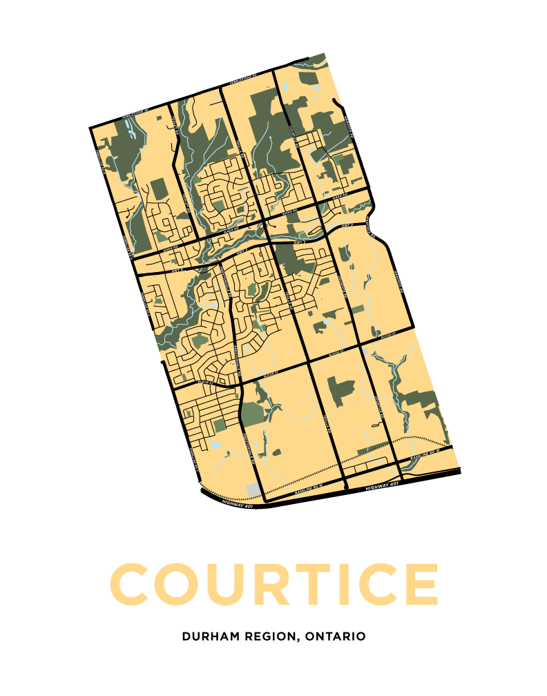 This is a map print of Courtice in Durham Region, Ontario. All major roads are labelled.