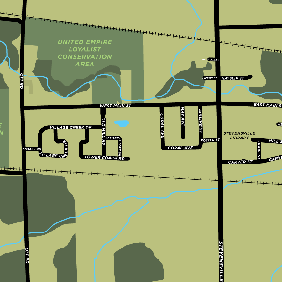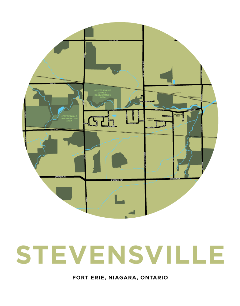 This is a map print of Stevensville in Fort Erie, Niagara Region, Ontario.