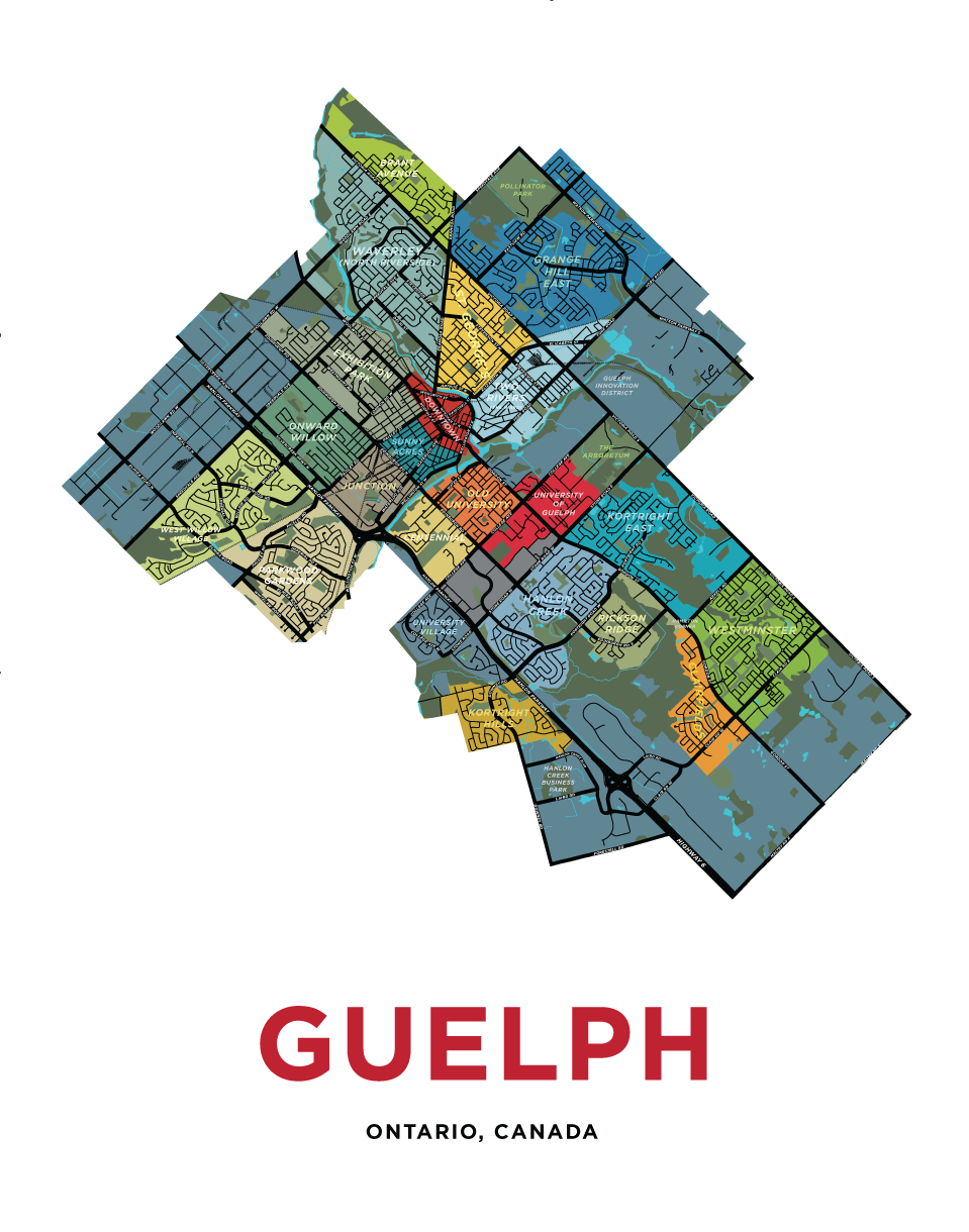 This is a map of Guelph, Ontario that highlights its various neighbourhoods. Major roads are labelled.