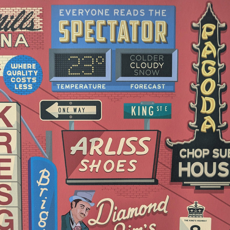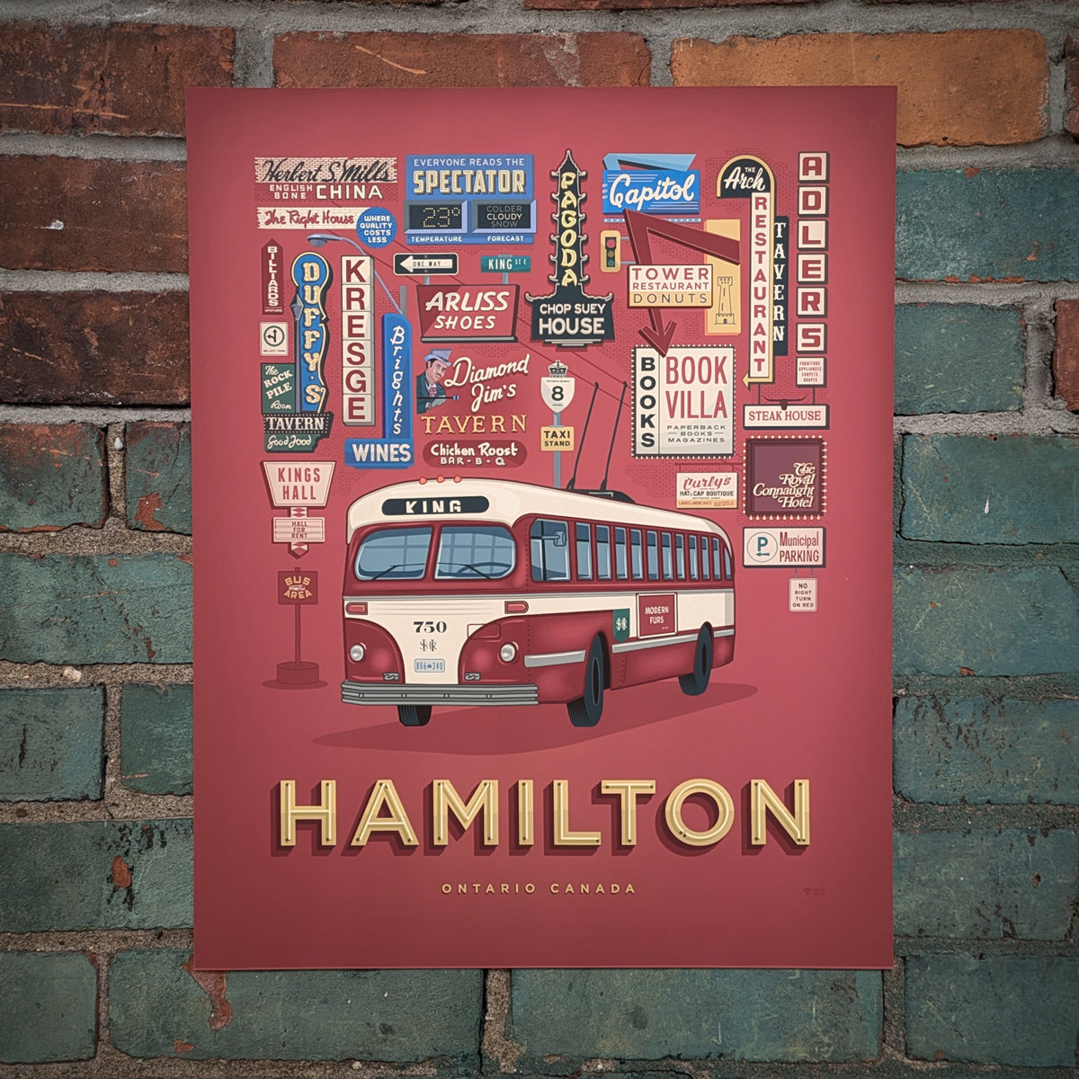 This is a digital print featuring an HSR Trolley Bus (#750 - CC&F Brill T48-A) against a backdrop of old signs from King Street East in Hamilton, Ontario. The roll sign indicates the King route.