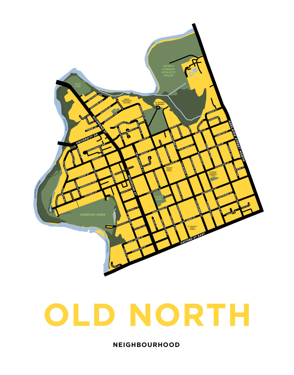 This is a map of the Old North London Neighbourhood. It's bordered by Adelaide Street North, Oxford Street East and the Thames River. Some landmarks here include Gibbons Park, King's University College and North London Athletic Fields.