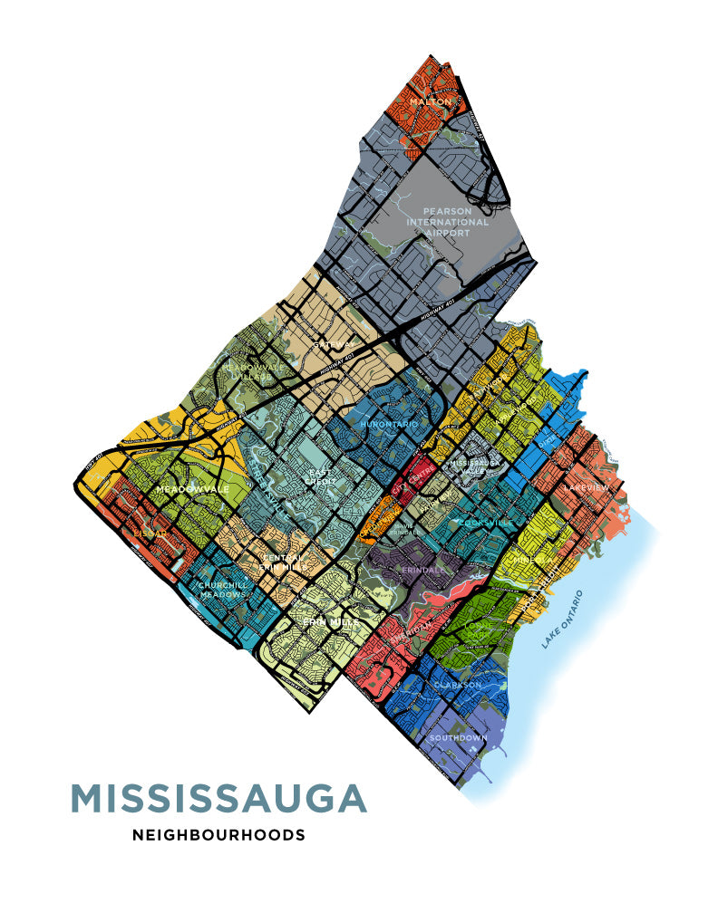 This is a map of the full city of Mississauga, Ontario. Major roads are labelled. Each neighbourhood is labelled and bears the corresponding colour of its corresponding neighbourhood map print found here.