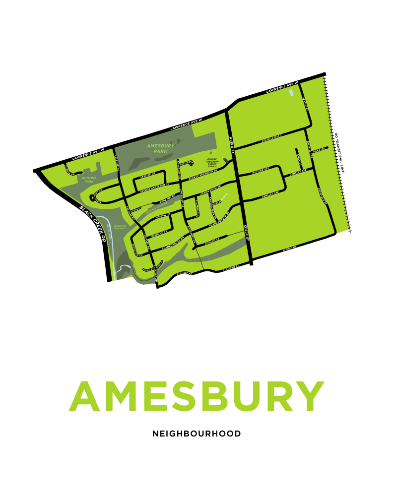 This is a map of the Amesbury neighbourhood in North York. It's bordered by Lawrence Ave, the GO Rail line, Gulliver Rd/Ingram Dr and Black Creek Drive.
