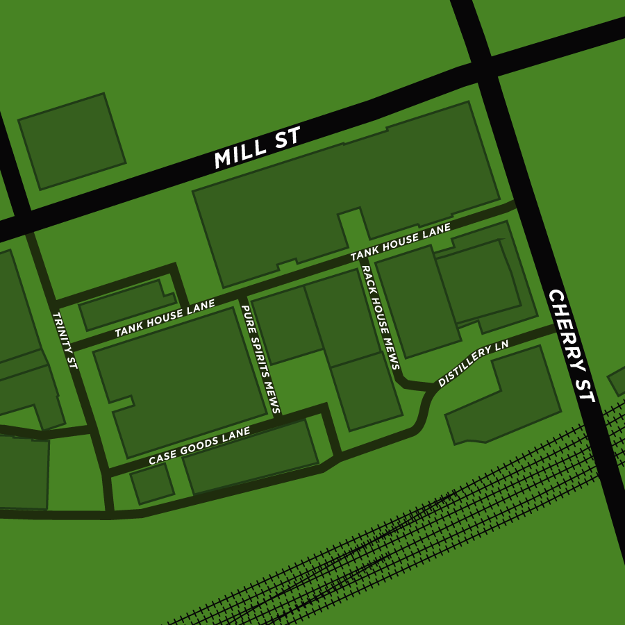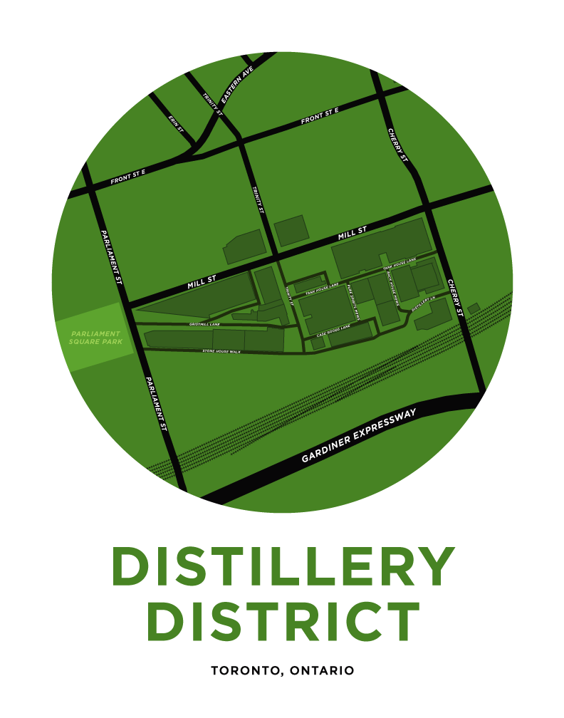 This is a map of the historic Distillery District in Toronto, the former Gooderham and Worts Distillery. It includes the district itself and some of the surrounding streets.
