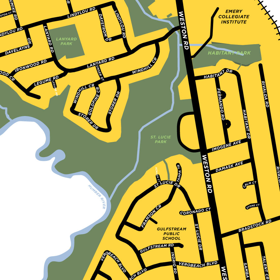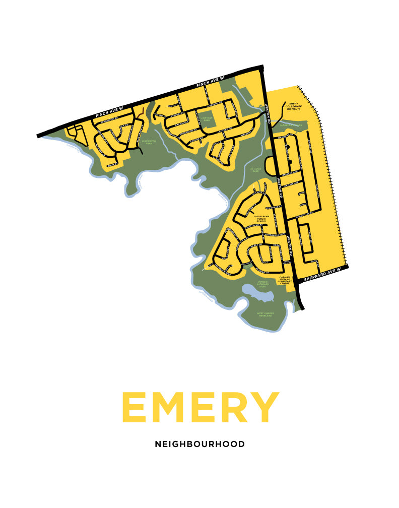 This is a map of the Emery neighbourhood in North York. It includes the area East of the Humber River to the rail lines, roughly between Finch and Sheppard Avenues. Some landmarks here include Carmine Stefano Community Centre, Emery Collegiate Institute and Bluehaven Park.