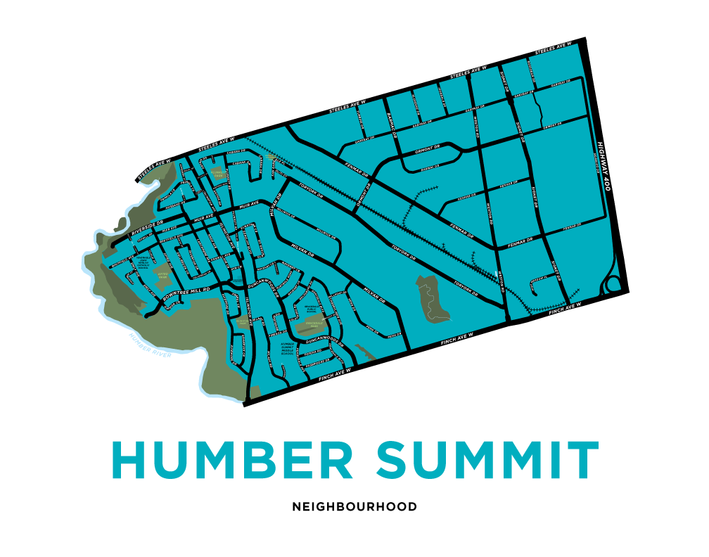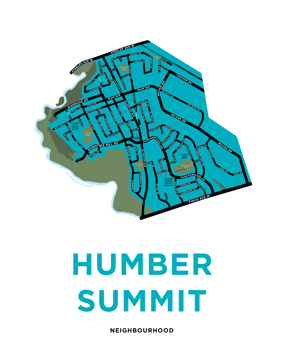 There are two versions of this print, a landscape version that includes the full neighbourhood all the way over to Highway 400, and a portrait version that focuses on the more residential section to the west.