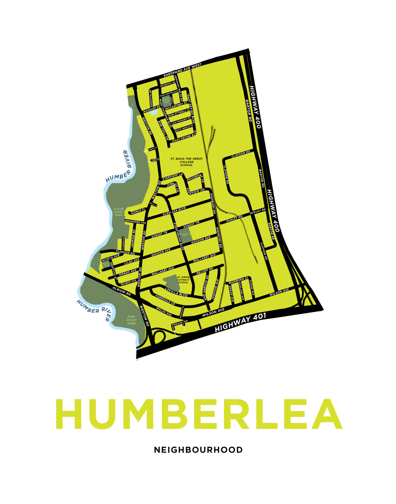 This is a map of the Humberlea neighbourhood in Toronto. It's bordered by Sheppard Avenue West, Highway 400, Highway 401 and the Humber River. Some landmarks here include St. Simon Catholic School, St. Basil The Great College School, and Joseph Bannon Park.