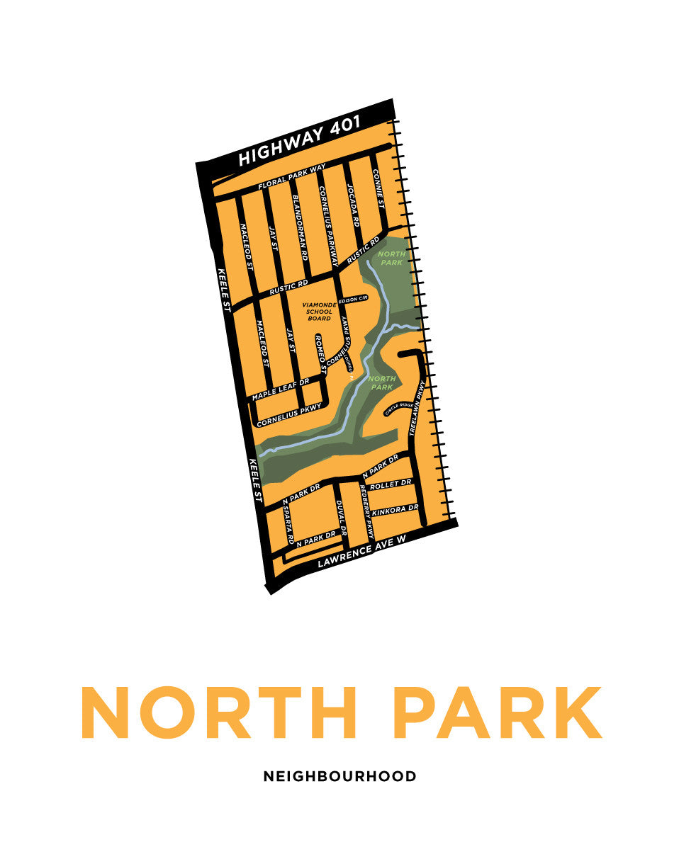 This is a map of the North Park Neighbourhood in North Park Neighbourhood in North York. It's bordered by Highway 401, Keele St, Lawrence Ave West and the CNR Tracks. École élémentaire Mathieu-Da-Costa is located here.
