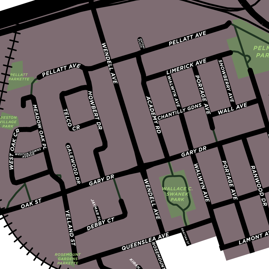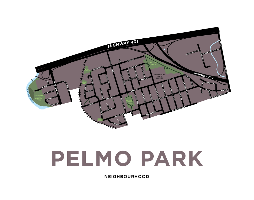 This is a map of the Pelmo Park neighbourhood in Toronto (North York). Some landmarks here include Pelmo Park Public School, Crawford-Jones Memorial Park and Wallace C. Swanek Park.