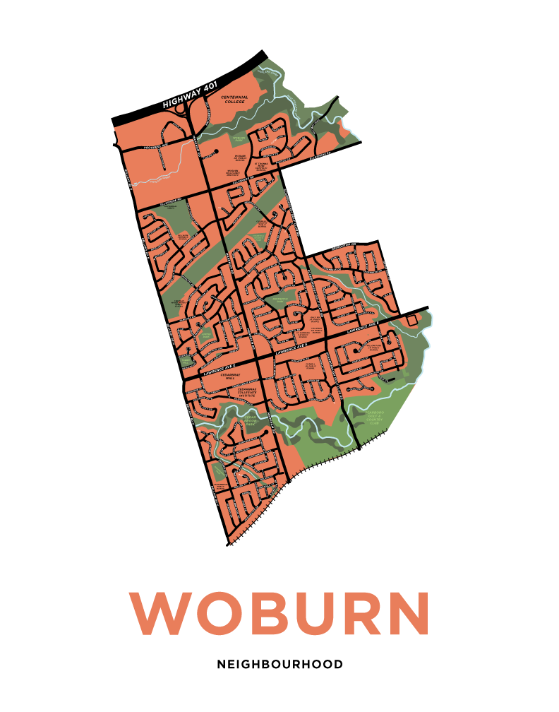 This is a map of the Woburn Neighbourhood in Scarborough. It's rough boundaries are roughly Highway 401 to the North, Orton Park Road to the East, Scarborough Golf and Country Club and the train tracks to the south, and Bellamy Road to the West. Some landmarks include Centennial College - Progress Campus, Densgrove Park and Cedarbrook Public School.