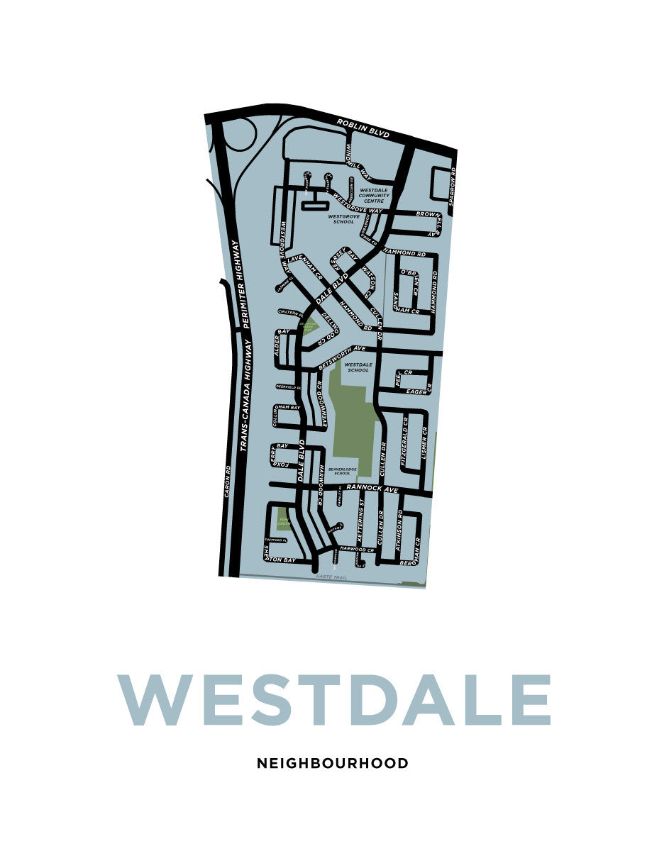 This is a map print of the Westdale Neighbourhood in Winnipeg. Its borders are Roblin Blvd, The Trans-Canada Highway, Harte Trail and Sparrow Rd. Some landmarks include Westdale School, Westgrove School and Beaverlodge school.
